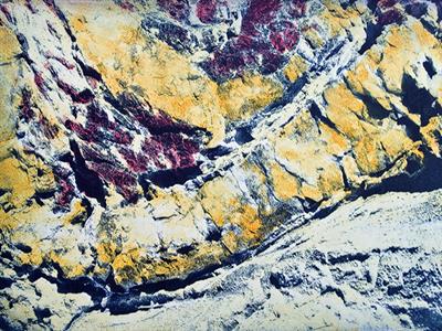Mae’r gwasgiant, haenau a chraciau yn y broses brintio yn cyfateb i brosesau mewn daeareg. Ymddengys fod ansawdd fythol y mater llifol a greodd y graig yn bodoli yn y ddelwedd.